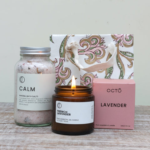A beautifully simple gift for restful evenings — Octo Dream Bath Salts and Aery Dream Catcher hand cream, presented in a hand block-printed cotton card gift bag.